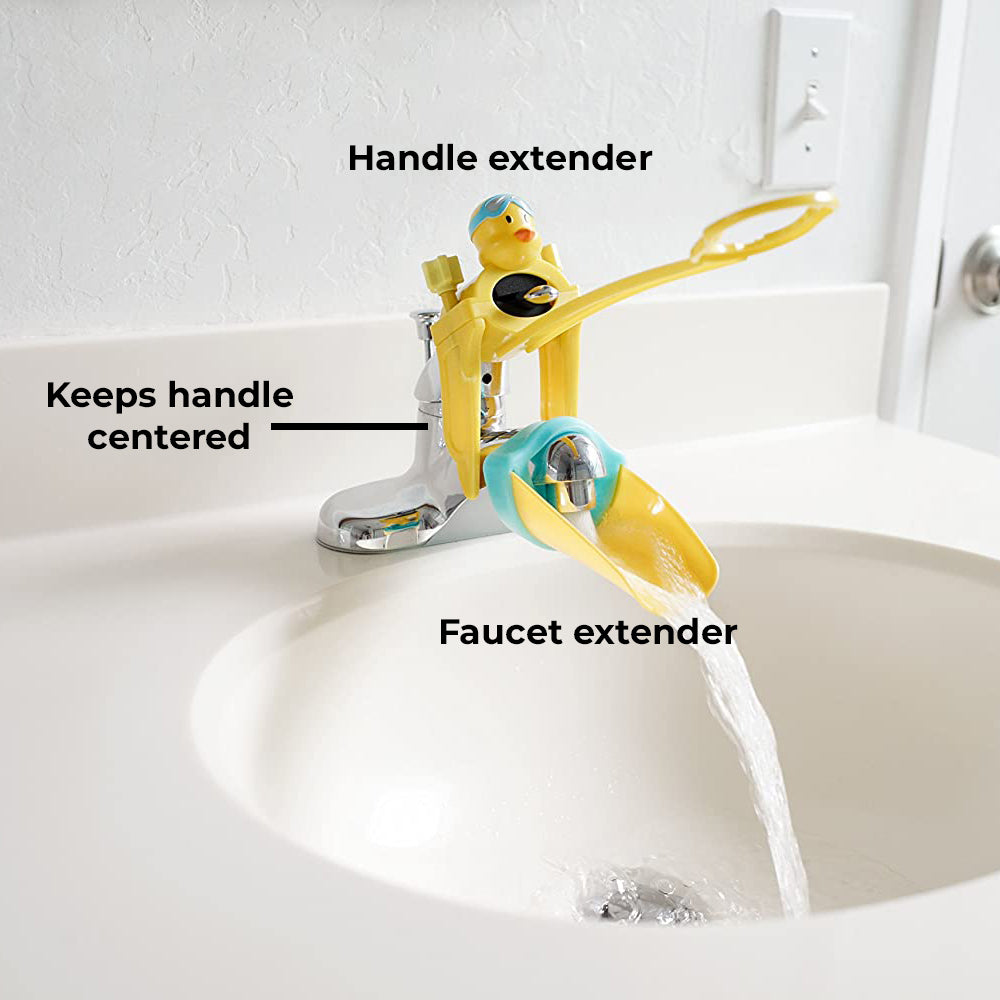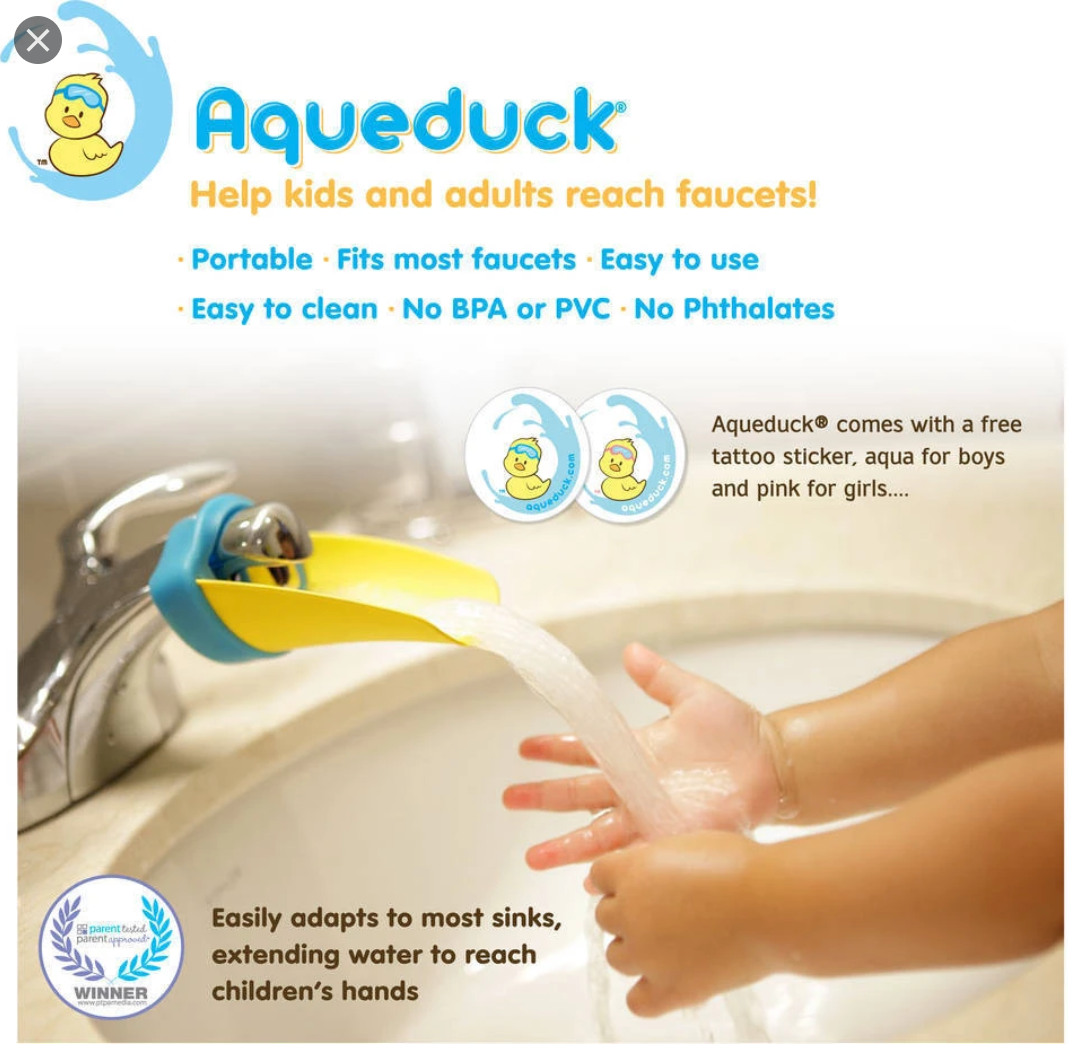 Aqueduck is the first ever handle extender with faucet extender to help your kids reach and wash their hands independently.